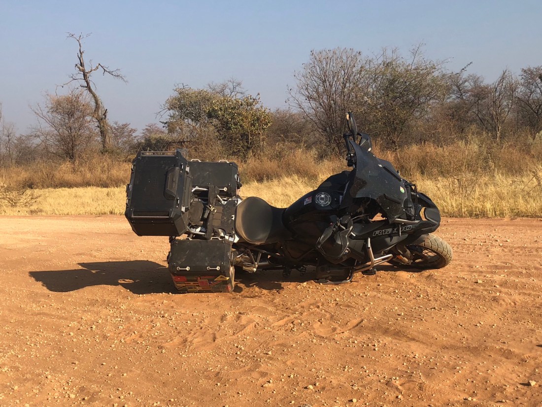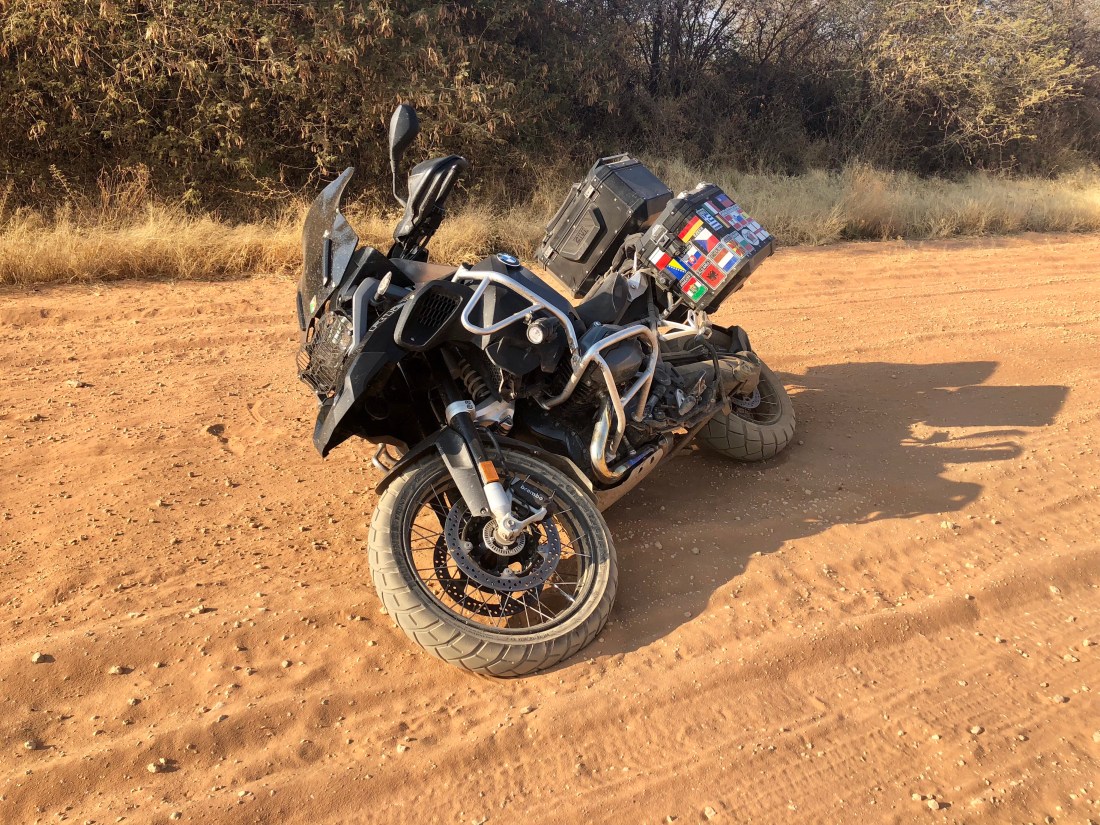 …. that is at least until myself and Simba had a disagreement about which way to get through a soft sandy stretch. Mind you it could have been that, as the sat nav was showing just two kilometres to the tar road, I let my guard down a bit. I had noticed the change in road texture but before I knew it the front tyre sank down and lodged in the sand spinning the bike in a pirouette like a ballerina.