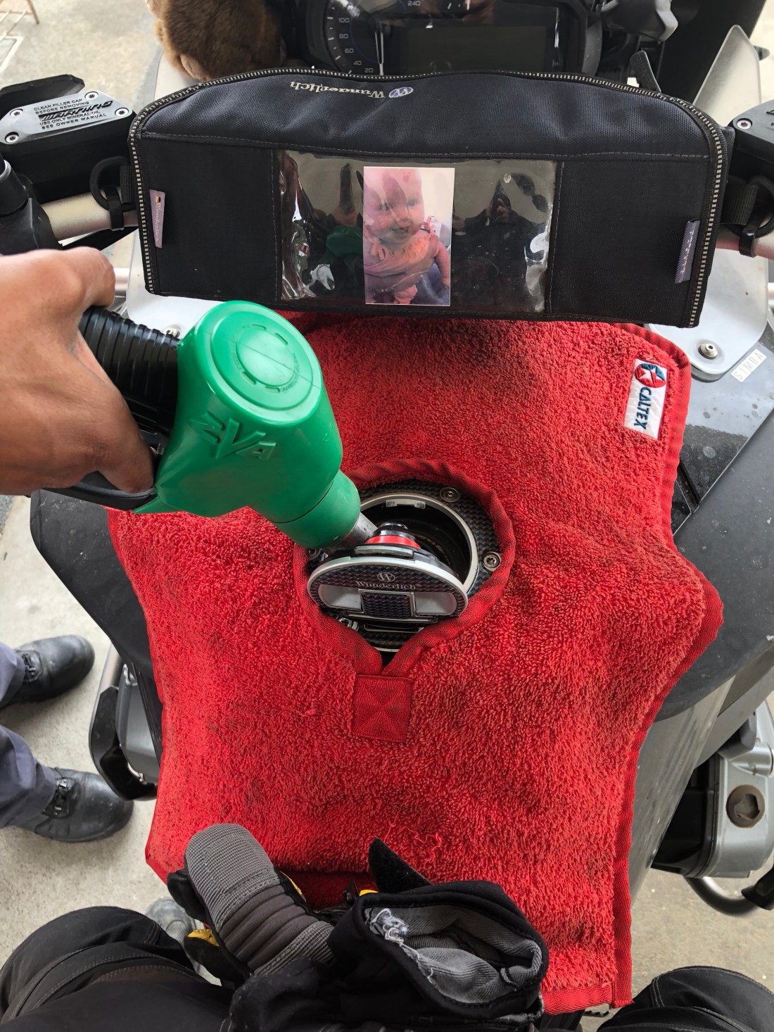 I stopped at my last refuel and hadn’t got a clue what was happening when the attendant put a splash bib on Simba to protect the tank.
